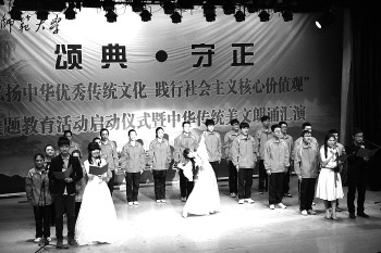 本报4月15日讯(通讯员 陈学宁 李艳梅 涂文鼎) 4月14日晚,由日照校区学生工作办公室主办的“弘扬中华优秀传统文化,践行社会主义核心价值观”中华传统文化主题教育活动启动仪式暨中华传统美文朗诵汇演,在该校音乐厅隆重举行。 本次活动的主题是“颂典·守正”,一颂、一守,典为今颂,正须持守,体现了传承者的姿态,也展现了践行者的担承。“作为建校于孔子家乡的大学,弘扬中华优秀传统文化,我们有着突出和独特的优势,我们也应有使命与责任的担当。”曲阜师范大学副校长、日照校区管委会主任马东骅在讲话中说。 在现场,书法作品“这是我的梦”配以沙画,让人惊叹;个人朗诵《将进酒》,表演者化身李太白,梦回大唐,如痴如醉。在短短一个小时的时间里,音乐厅里不时响起阵阵雷鸣般的掌声。期间穿插了舞蹈《礼仪之邦》以及武术表演《梅花三弄》,更是将现场推至高潮。 据介绍,中华传统文化主题教育活动将贯穿2014年全年,包括中华国学经典诵读大赛、百句经典语录征集、国学讲堂、国学达人秀、曲园汉字争霸赛、沐浴国风之我爱记诗词、国学知识推广网站制作大赛、超级演说家—传统文化篇等13项具体活动。