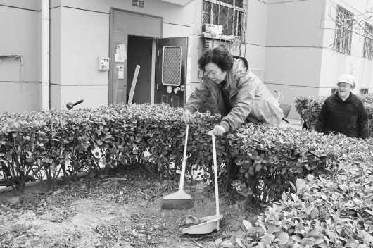 | |  | 李咏兰正在义务清扫小区卫生。 |