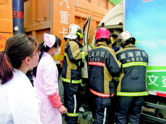 4月15日10时56分,文登泽头镇道口大桥处,一辆厢货撞上一辆自卸车,司机被困车内。文登消防龙山中队出动两台车、14名队员前往救援。消防队员用牵引车把两车拉开,再用机械扩张驾驶室救出司机,司机无生命危险。