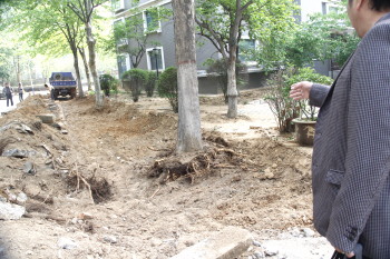 | 鲁能康桥小区12号楼旁边的人行道已经被挖开。实习生 王乾宇 摄 |