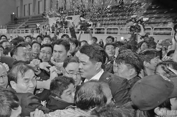 ◥17日,韩国总理郑烘原(中间戴眼镜者)被情绪激动的家属围堵起来,质问救援不力。