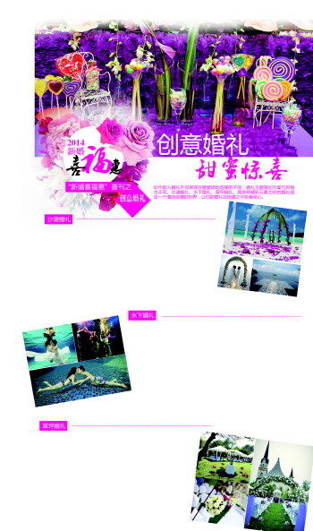 在户外婚礼已经成为普遍时尚的今天,在即将到来的夏日里,不如一起下水,感受美丽水世界。时下开始流行的水下婚礼,在蔚蓝的海洋中,见证彼此最甜蜜的爱情。水下婚礼一定会将你卓尔不群的一面展现给前来祝贺的亲友们,让你一潮到底!