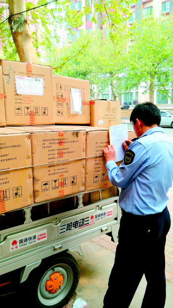 16日下午2点,记者跟随稽查科的执法人员来到长清区玉符街上,这条街上快递林立,被当地人称为“快递一条街”。在一家快递公司里,一大箱少儿用颗粒药品正在准备发往归德镇。执法人员对药品的发送人和接收人进行了详细登记。