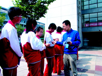 4月12日至15日,章丘市2014年初中学生信息技术课学业水平考试在章丘中学(山东财经大学附属中学)举行,共有12000余名初三学生参加。图为学生们秩序井然地入场。