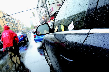 在华茂街上,停放在路边上的一辆私家车的车窗上被插了好几张名片。 本报记者 李泊静 摄