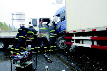 17日早6时6分,胶州湾高速红岛出口处,一辆集装箱车与一辆小型货车、一辆面包车发生连环追尾,货车内3人被困。高新区公安消防大队16名救援官兵经过近30分钟的紧张救援,将被困3人救出并送往医院进行救治。