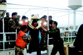 海警将患儿顺利送到积米崖码头。 (图片由灵山岛边防派出所提供)