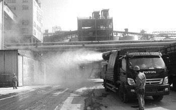 一公司的射雾车正在对木薯干散发罐进行喷雾降尘。