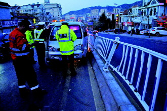 ◤面包车撞坏了两段护栏。 记者 吕修全 摄
