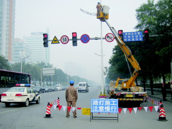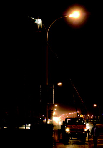 施工人员正在对路灯进行检修。 本报通讯员 董晨 摄