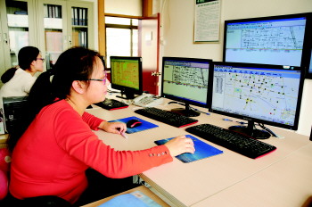 工作人员正在电脑前监测路灯。 本报记者 姜文洁 摄