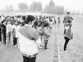 刘静在看着自己班里的孩子上体育课。 本报记者 杨兵三 摄