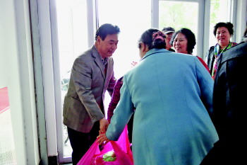 | 艺术团的服装到了,刘永海(左)赶紧上去帮忙。