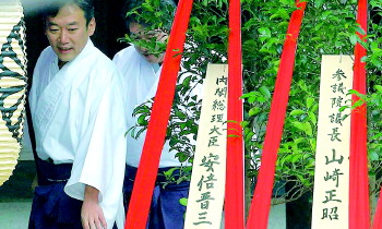 日本首相安倍晋三21日以“内阁总理大臣”名义向供奉有二战甲级战犯的靖国神社供奉了称为“真榊”的祭品。