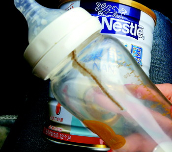 18日上午,王先生的母亲把奶粉舀到奶瓶里,冲上水给宝宝喂奶,不经意看到奶瓶里有一个细细长长的东西。“仔细一看,发现那东西很像条虫子,有6厘米长,透明的,身体上还有血丝。再一看,瓶底处也躺着一条2厘米长的,不知是另外一条,还是那条虫子断掉的一部分。”王先生说。