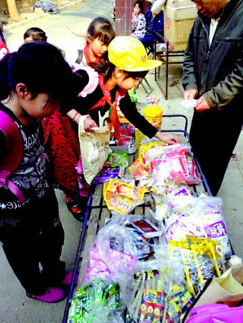 省城一小学门口,下午放学后,很多小学生成群结队地到卖零食的小摊前选购小零食。