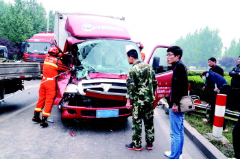 本报济宁4月21日讯(记者 路帅 通讯员 盛贺贺) 21日上午,327国道上一辆厢式货车与一辆皮卡车发生追尾,厢式货车上一人被困。济宁高新区消防部门到场后用牵引绳拉开撞瘪的驾驶室,成功将其救出。