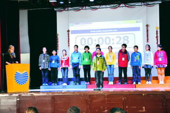 16个学生经过5轮激烈角逐,2名学生脱颖而出,参加决赛。10点半,总决赛开始,台下坐满了学生家长,12名低年级组学生和12名高年级组学生分别在台上进行决赛。考试全程英文,有的学生因为不习惯英文编号,一度没听明白,愣了神,引得台下一阵哄笑,而有的学生则应对老师提出的问题对答如流。