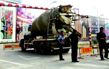 21日,在东方红路向岔河西大道拐角的地方,一辆水泥罐车被卡在了2.9米限高杆下动弹不得。