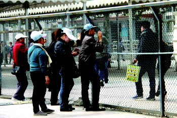 21日,在火车站入站口位置,多名中年妇女站在栅栏外,吆喝着向来往旅客“推销”客运路线。车站工作人员多次劝说,收效不大。 本报记者 王小会 摄