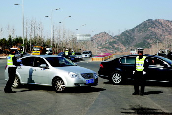 世园会周边道路管制,民警车车辆进行引导。(资料片)