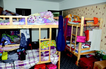 民警当天来到这个小区了解情况,在一栋居民楼的五楼东户,发现里面确实在经营家庭旅馆。这是一间三室一厅的普通户型,总面积100平米左右。在三间卧室里,放置着10张上下铺木床,共20个床位。本来空间就不大的卧室全被床挤满,几乎没有放其他家具的空间。床和床之间,仅用一个布帘隔着。在客厅一角,还铺设着一顶大帐篷,按2个床位收费。厨房、客厅、卫生间都是共用的。