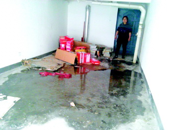 车库东面墙靠位置有处下水管道接口处,李女士说当时就是这里脱节漏水,是24号楼中单元东户的污水管道。“车库是借别人的,在这存放鞋一年多了,前一次来车库是去年9月底,一个多月前放货时发现管道漏水,浸湿30多双皮鞋,另外三十多双鞋虽未浸水,但也受潮损坏。”李女士说,当时找了物业,推说让她找房主和开发商解决。