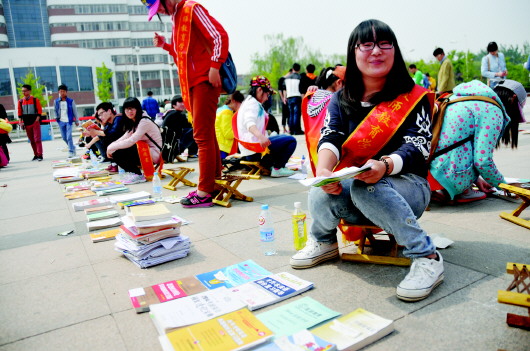 20日上午,滨州学院各学院志愿者在售卖一些毕业生的课外书籍及考研书籍。