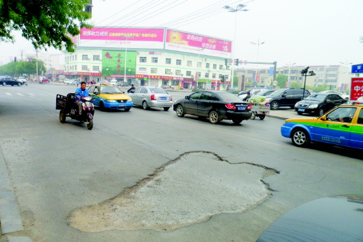 “黄河三路渤海十路路口东侧有一块路面都没了,路过的车都想绕过这一块路面,给交通安全带来很大隐患。”市民王先生拨打本报热线称。
