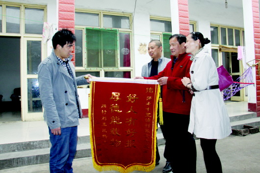 11日一大早,刘志云老人的女儿和女婿再次来到张金杰家中,并送来了一面锦旗和2000元现金,一定要他收下。老人的女儿说,老人送到医院时已经脱水了,年龄那么大,如果再晚一天情况就很危险了。张金杰说什么也不肯收下钱,只说正好让自己碰上了,遇到这种事都应该伸出援手。