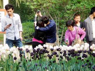 时间:2014年4月13日 自述:一对青年男女以郁金香花作为背景,用手机拍下合影。 点评:留下美好瞬间。