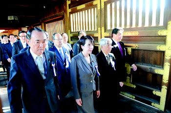 | ◥4月22日,在靖国神社本殿,超党派国会议员联盟“大家一起参拜靖国神社”成员参拜靖国神社。 新华社发 |