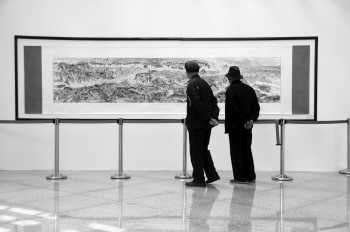 本报4月22日讯(记者 张浩 刘蒙蒙 见习记者 段婷婷)自18日开幕以来,为期五天的第四届中国画节·中国潍坊第七届文化艺术展示交易会于22日落下帷幕,1000多个展位迎来了45万人参观,交易额达10.38亿元。 22日是此次展会的最后一天,虽然没有了开幕时摩肩接踵的热闹,参观的市民仍然络绎不绝。在鲁台会展中心中国画节展区,风格各异又精彩万分的名人佳作让前来参观的书画爱好者流连忘返。 由30多位国内著名书画家历时一年共同创作完成226米长的《黄河万里图》国画长卷气势磅礴。22日上午,一位老人蹲在这幅图前,将该图的题字《黄河万里图赋》抄写在随身带着的烟盒上,老人是位普通工人,今年62岁了,平时喜欢书法。他原本想用手机将题字拍下来,又怕看不清楚,老人拿出随身携带的笔,把烟盒撕开,蹲在地上抄了起来,准备回家练习。 本次节会不但吸引了大量本地市民,一些外地的爱好者也慕名前来欣赏。在画节现场,两位穿着成都体游俱乐部字样的夫妻吸引了记者的注意。丈夫蔡华江今年70岁了,他跟妻子是骑行爱好者,此次是特意来潍坊的,先看了风筝会、菜博会,又来到了文展会。 记者了解到,此次本届节会中国画交易额96300万;油画交易额5300万;其他艺术品交易额2200万,共计103800万元。参观人次45.1万人。