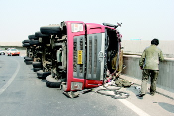 22日上午,一辆货车在京台高速德州段至衡水方向立交桥处侧翻。事故发生后,德州高速交警支队出警迅速处置了此次事故。 本报记者 董传同 通讯员 申毅 摄影报道