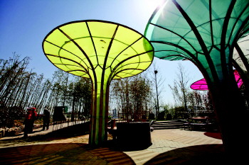 |  | ◥园区里一处竹藤主题的遮阳篷独具特色。