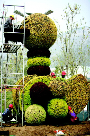 |  | 园艺工人在对鸭子形状的花摆做最后的调整工作。 |