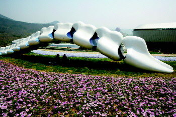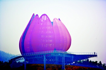 | 雕塑《地脊》,象征着世园会的脊梁,表达对自然的赞美。 |  | ▲“青岛之花”已经绽放在位于天水湖畔的小山坡观景平台上。