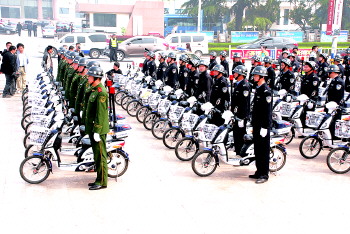 | 活动现场,东港分局为10个派出所100名民警配发警用电动车。