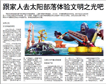 跟家人去太阳部落体验文明之光吧 文明之光 文化体验的典范 去年4月开业后,太阳部落景区把主题游乐与古典文化相结合的市场定位获得了市场的广泛认可,短短的一年内,太阳部落景区已经成为山东文化主题公园的排头兵。太阳部落没有为取得的成绩沾沾自喜,而是顺势推出了更能体现文化特色的二期十大项目。 4月26日,太阳部落文明之光项目将正式开业。文明之光的外形是体现大汶口文化特色的七个彩陶巨碗,每个碗的直径达24米,高十几米,文明之光是景区研发团队呕心沥血的扛鼎之作,该项目将中国的史前文明与中国五千年的文明史浓缩在七个巨碗的体验中,完美实现文化创意与现代科技的结合。 作为旅行社代表的刘先生有幸成为文明之光的首批体验者,他对文明之光赞不绝口。刘先生绘声绘色地说:“乘坐上观光船,不一会儿感觉一股激流推动漂流筏急速上升,眼前一片黑暗,仿佛进入混沌世界,突然眼前变得明亮起来,盘古开天地、黄帝大战蚩尤、共工撞倒不周山等场景让人应接不暇,正当意犹未尽时,眼前的场景变换为尧舜禹领衔的圣贤时代,其中的大禹治水场景惟妙惟肖,之后是西周华夏统一、百家争鸣和春秋战国,然后是秦统一六国直到唐宋元明,最后是畅想中国梦。”刘先生继续说到:“参加完文明之光感觉热血沸腾,唤起了内心沉寂已久的民族自尊心和自豪感,在明代中期以前中国的文化和科技一直居世界领先地位,我们一定能重塑昔日辉煌,迎来中国梦。”刘先生还提到,文明之光是穿越版的中国历史教科书,大人能温习历史,孩子能了解历史,是很生动的历史教材。刘先生还表示,一定多组织游客到太阳部落感受文明之光的巨大魅力。 文明之光丰富太阳部落 家庭游产品 一般的主题乐园以年轻人为主要消费群体,游玩项目设置过分考虑年轻人的感受,而太阳部落打破了这种惯性思维,项目更注重文化性,更注重老少皆宜,“老少通吃”。借用太阳部落景区总经理孔祥海的话说:“太阳部落是一个文化主题公园,所有游玩项目和设施突出文化属性,充分考虑到各个年龄段游客的需求,上至六十六、下至四五六,都可以在太阳部落找到适合游客的项目。”孔祥海还提到,这两年旅游市场消费主体变化很快,已经由以前的单位团体为主过渡到以家庭为主,亲子游、家庭游游客比例急剧增加,目前景区的家庭游游客量已占到景区总接待量的六成以上,太阳部落大部分项目适合家庭游游客。 记者在太阳部落采访看到,洪荒漂流、狂奔(卡丁车)、小猪运动会、亲子转转杯、大汶口文化体验馆、激战鳄鱼岛、女娲补天、狩猎归来(花车巡游)、山洪暴发等项目成为家庭游游客喜欢的项目。 随着文明之光的开业,文明之光将成为最受欢迎的家庭游项目。在乘坐文明之光的过程中,随着场景的变换,各种历史文化元素随之变换,家庭成员可以一起了解历史、温习历史,将寓乐于教发挥到极致。据了解,随着五一临近,太阳部落已经接到很多旅行社和自驾游爱好者到太阳部落游玩的订单,相信随着文明之光的开业,太阳部落将会迎接新一轮的游客高峰。 文明之光到底有多好,还是五一节亲自来体验吧。 (陈润) 带给市场和游客惊喜不断的泰安太阳部落景区,二期即将揭开神秘面纱。4月26日,太阳部落景区的标志性、划时代的文化体验项目——文明之光将正式开放纳客,五一小假期,游客就可以来太阳部落感受文明之光独树一帜的文化体验。文明之光仅仅是个开始,二期另外9个重磅项目将在今年陆续开放,将带给游客更多的惊喜。