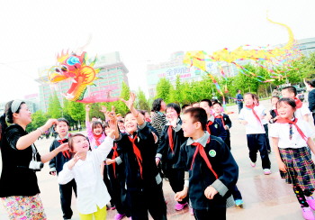 23日下午,济南市趵突泉小学学生们在老师的带领下,到泉城广场放飞他们制作的风筝——“名泉龙串儿”。过去的10年间,济南市趵突泉小学已连续组织了10届风筝节。