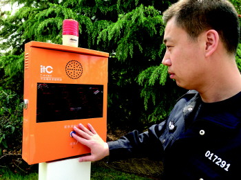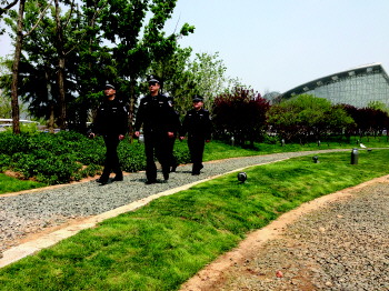 | 游客只要一按报警点的按钮,就可以直接与指挥部对话。 |  | 民警在园区里巡逻。 |  | 黑色的点就是园区内设置的报警点。 |