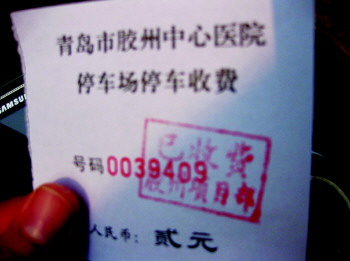 | 胶州中心医院门口很多车辆进出。 赵波 摄 |  | 胶州中心医院提供的停车收费“发票”是一张小纸片。 赵波 摄 |