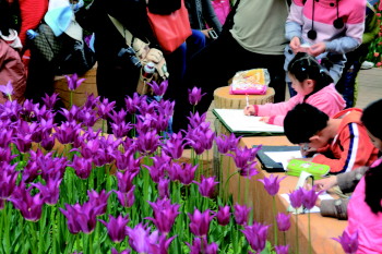 济南红叶谷一片片郁金香花争奇斗艳,让山间的这抹“绿”不再孤单。鸟语花香、绿色点缀,瞬间让谷里变得如画一般。沿着展区的小路一直走上去,红色、黄色、紫色等颜色的郁金香映入人们的眼睑。如此的美景吸引了许多游客来到这里,看到他们脸上洋溢着灿烂的笑容,不难猜出是那片花海的功劳。除此之外,一些小游客也来到这里,拿着画笔,将美景画在自己的画纸上。