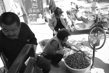 | 24日,在平阴县崔山头村,花农正在过秤,卖玫瑰花蕾。 |