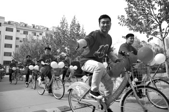 | 4月20日,滨州一市民借用18辆公共自行车组成迎亲队伍,去迎娶新娘。 本报记者 李运恒 摄 |