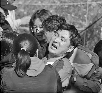 约20名失踪者家属在殴打韩海岸警卫队副队长崔相焕(中)。