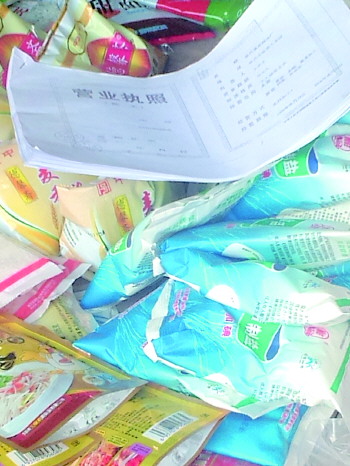 | 一商家在展示三证(营业执照、食品流通许可证、税务登记证)。 |  | 卖家出示的营业执照。 |