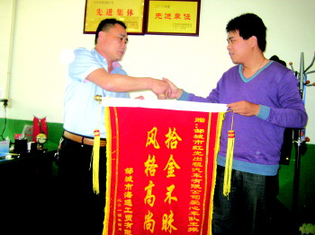 | 赵先生将锦旗递给的哥王振。 |