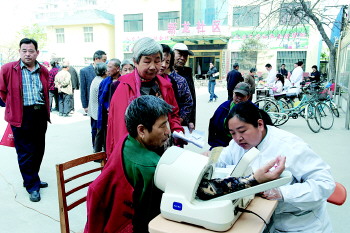 为提高辖区老年人身体健康水平,龙桥街道社区卫生服务中心协同区中医院10余名专家医师深入社区、村庄,开展了为期15天的免费健康查体活动。活动中为辖区65岁以上老年人开展上门免费健康查体,深受居民欢迎。图为新龙社区的老年人在测血压。 本报通讯员 洪霞 廷芳 摄