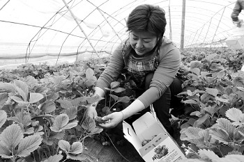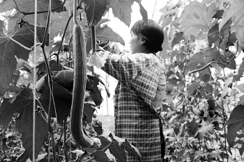 | 一位工作人员正在整理丝瓜藤。 |  | 一位游客正在采摘园内的有机草莓。 |